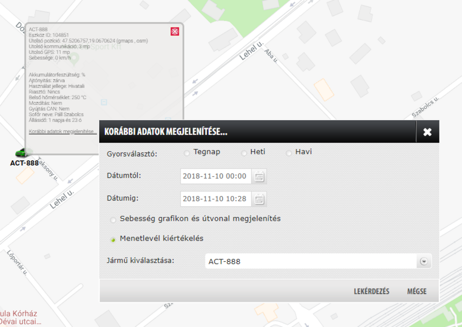 A térképen látható eszköz ikonjára kattintva további - a választott előfizetői csomagtól függő - információkhoz juthat. Ebben az ablakban is lekérdezhetők a korábbi útvonalak adatai, a 'Korábbi adatok megjelenítése' lehetőséggel (ez a Útvonalkiértékelés menü egyszerűsített változata).